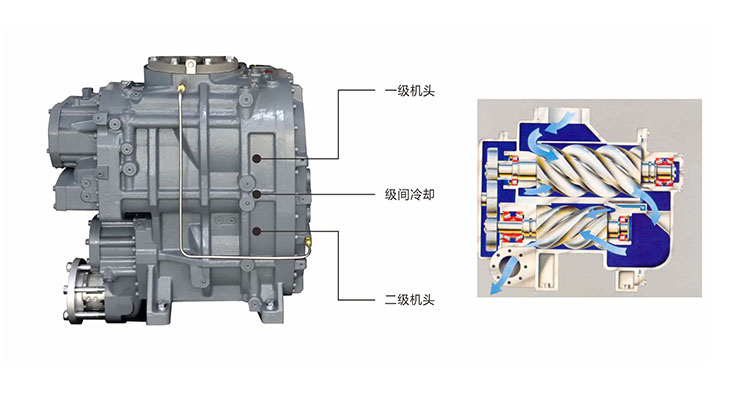 采用立體霧簾中間風冷降溫,實現(xiàn)了近似等溫,等壓比壓縮,比單級永磁變頻機組功率更低10-15%.